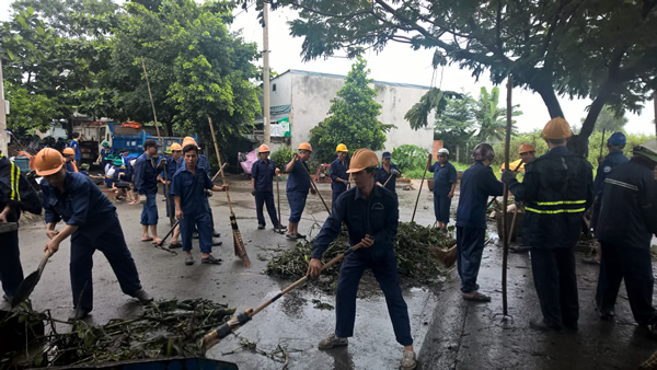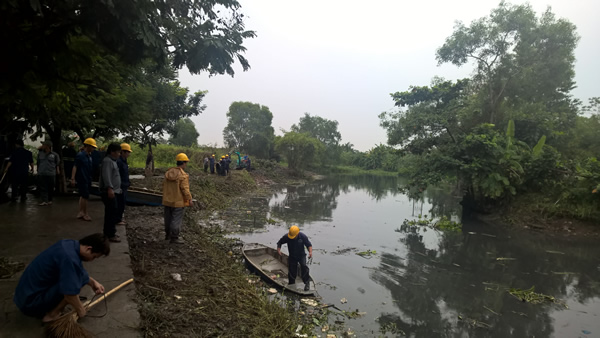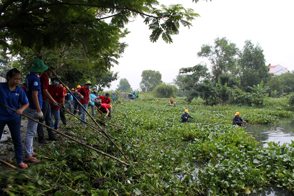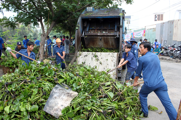 60 công nhân, đoàn viên thanh niên Công ty TNHH MTV Dịch vụ công ích quận Gò Vấp cùng xuồng, dụng cụ phối hợp cùng các chiến sỹ tình nguyện mùa hè xanh