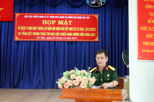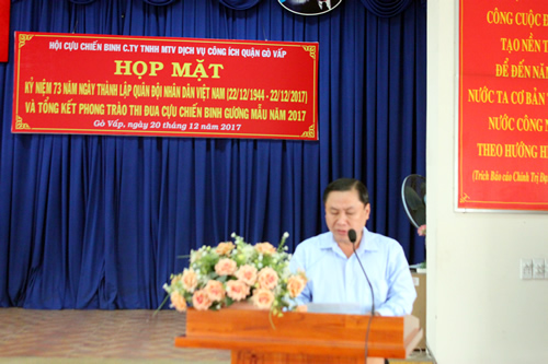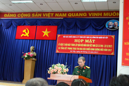 Sáng ngày 20/12/2017, nhằm tổng kết, đánh giá việc thực hiện Nghị quyết của Hội Cựu chiến binh Công ty và triển khai hoạt động hội năm 2018, Ban chấp hành Hội Cựu chiến binh Công ty TNHH MTV Dịch vụ công ích quận Gò Vấp đã tổ chức Họp mặt Tổng kết phong trào thi đua “Cựu chiến binh gương mẫu” năm 2017 và họp mặt kỷ niệm 73 năm ngày thành lập Quân đội nhân dân Việt Nam.