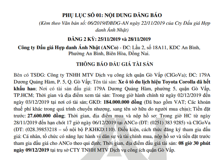 Công văn đăng báo và thông tin đăng báo đấu giá tài sản: xe ô tô du lịch Toyota