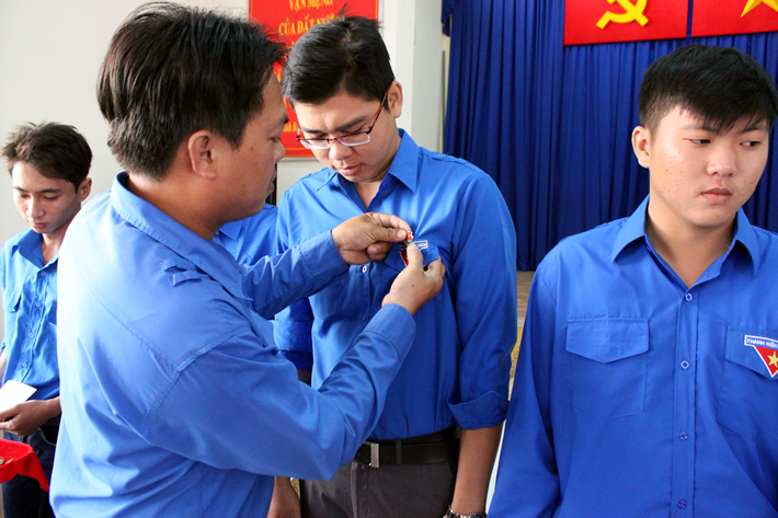 Đồng chí Võ Hoàng Phi – Bí thư Đoàn cơ sở trao Huy hiệu Đoàn cho 13 thanh niên ưu tú được đứng vào hàng ngũ Đoàn TNCS